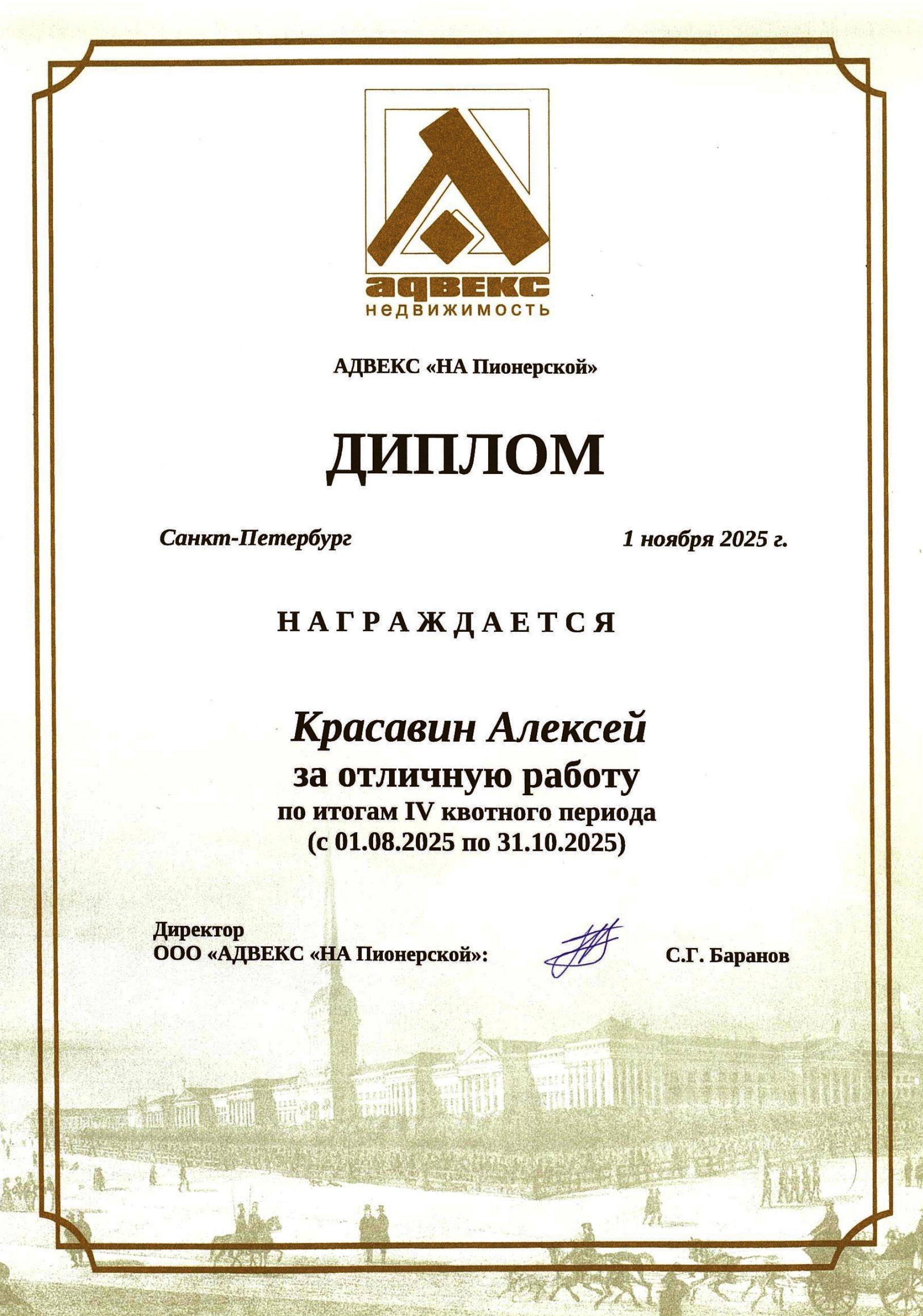 Меня зовут Алексей Красавин, я профессиональный риэлтор и веду свою деятельность в качестве специалиста по недвижимости агентства Адвекс в Санкт-Петербурге и Ленинградской области. Специализируюсь в сфере предоставления услуг по покупке и продаже вторичной и загородной недвижимости, по покупке в строящихся жилых комплексах, а также аренде.